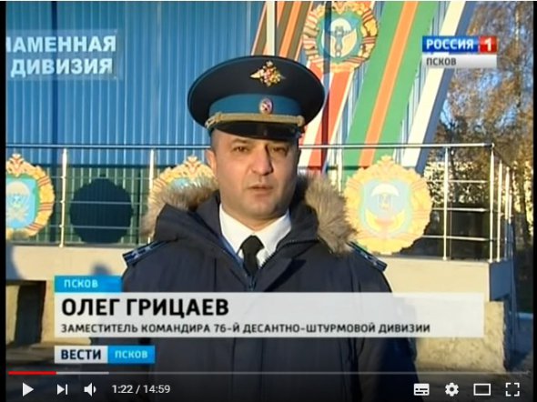 2008-го Грицаев участвовал в войне против Грузии, за что был награжден орденом Мужества. В октябре 2015 года уже в звании полковника был назначен на должность заместителя командира 76-й ДШД (архив, видео ГТРК "Псков").