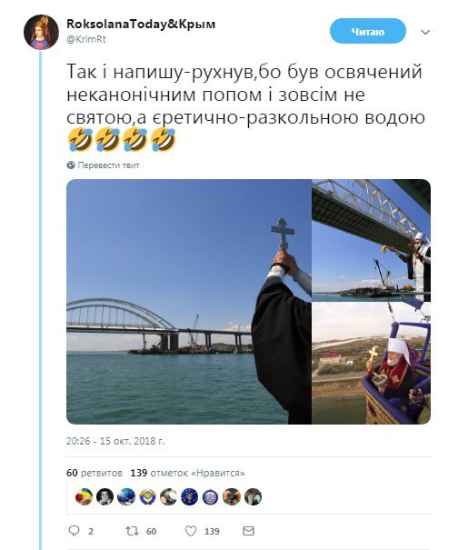 "Так и напишу - рухнул, потому что был освящен неканоническим попом и совсем не святой, а еретико-раскольной водой. Свидетели Иеговы или как они там, более канонические и оцерковленые, чем вы! Покайтесь, греховодники", - подписал фото блогер под ником RoksolanaToday&Крым в Twitter.