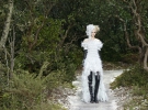В качестве аксессуаров предложены высокие сапоги-чулки с витиеватыми кружевными узорами. Моделей украшали головные уборы из перьев, имитация оперения была использована и в макияже.