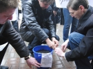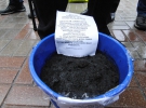 В 9.00 пикетчики разворачивают агитки и флаги. Председатель общественной организации "Наступ" Руслан Секела выставляет 3-литровое ведро, наполненное отходами иловых полей Бортнической станции аэрации, которая находится возле Киева.
