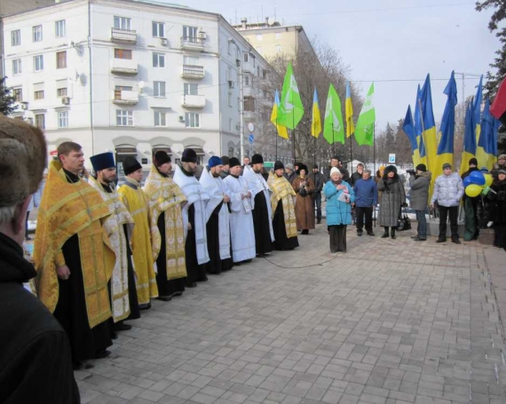 Среди участников митинга - преимущественно представители "Фронта перемен" и "Свободы". Митингующие вместе с несколькими представителями украинских церквей молились за Украину и собрали карту государства из отдельных пазлов. В конце митинга запели национальный гимн.