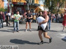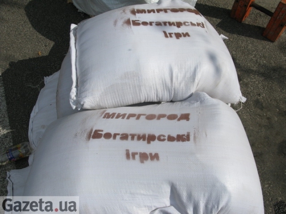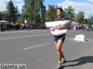 Организаторы проводят жеребьевку среди участников и объявляют о начале соревнований. За кубок победителя будут соревноваться команды из Гадяча, Кобеляк, Зинькова и Миргорода. В каждой по 3 участника. Спортсмены переносят 6 мешков с песком на расстояние 10 метров. Вес каждого 70 кг.