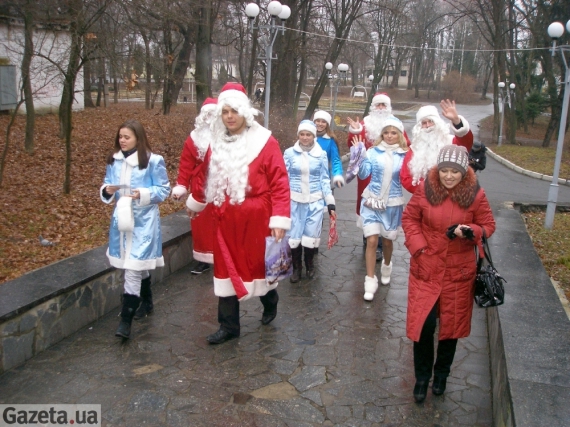 "Даем им календарики от городского головы и конфеты для детей. Костюмы арендуем. Ездят по всем маршрутам трамваев и троллейбусов в течение дня. Работают в три смены. Первая - утром, вторая - в обед, третья - после обеда", - сказал он.