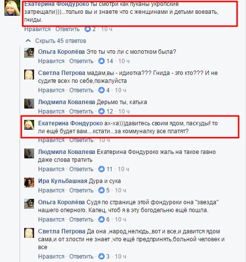 "Ты смотри как п*каны укропские затрещали. Только вы и знаете, что с женщинами и детьми воевать, гниды", - написала она.