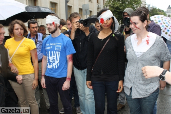 Участники акции, загримированные под жертв пыток, пытались убедить "прокурора" провести расследование избиения в милиции.