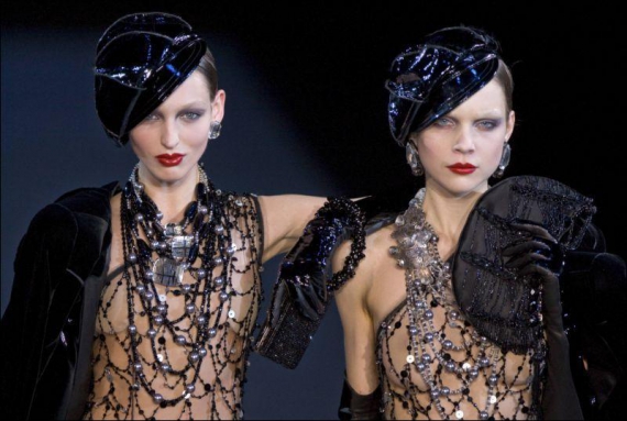 Джорджио Армани стал первым известным дизайнером, который открывал Неделю моды в Милане своей коллекцией для линии Emporio Armani. Высокие каблуки, гольфы по колено, экстравагантные ювелирные украшения – отличительные черты коллекции Emporio Armani в этом сезоне. И, конечно, маленькое бархатное черное платье стало верхом стиля "скромной экстравагантности".