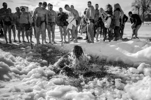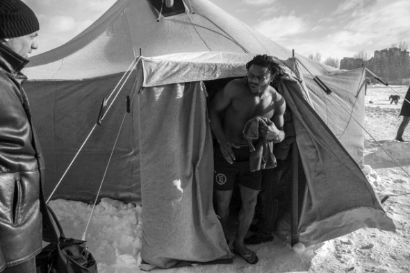 Общая раздевалка устроена в большой армейской палатке. Нджатах выглядывает на секунду, морщится и исчезает. Но вскоре он появляется вновь, с полотенцем на шее, и бежит к полынье.