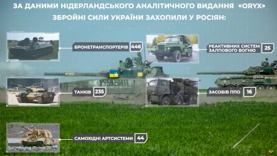 По данным нидерландского аналитического издания "Oryx", ВСУ захватили у россиян 446 бронетранспортеров, 235 танков, 44 самоходных артсистем, 25 РСЗО, 16 средств противовоздушной обороны.