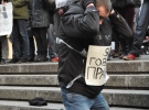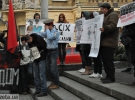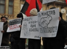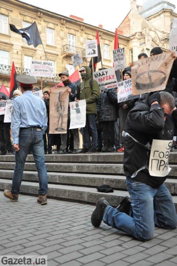 Несколько десятков ребят протестовали против политических репрессий и произвола милиции. Они держали в руках плакаты с надписями "Милиция с уродом", "Банду геть", "Долой министров - долой капиталистов", "Наше оружие - солидарность", "Беркут защищает богатых от бедных" и национальные и красно-черные флаги. Столько же милиционеров вышли на улицы посмотреть на пикет. Мужчины в штатском снимали его на портативную камеру.