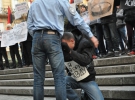 Кроме пикета организовали и небольшой перформанс. Парень в импровизированной одежде милиционера бил и издевался над другим, одетым как обычный украинец. У него на груди был приклеен плакат: "Я говорю правду". Этим организаторы протестовали против "выбивания" показаний правоохранителями, запугивания и искажения фактов.