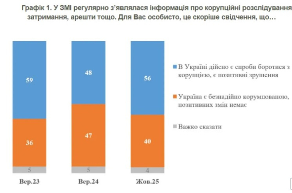 По состоянию на начало октября 2025 года 56% опрошенных украинцев считают, что есть реальные попытки преодолеть коррупцию. 40% граждан считают страну "безнадежно коррумпированной". В предыдущие годы этот показатель колебался от 36% до 47%.