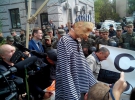 У входа в посольство стоят активисты ВО "Свобода" и организации "Сокол". Они держат плакаты с лозунгами. На одном из них написано "Смерть России". На асфальте лежит помятый российский флаг. Один человек держит виселицу с повешенной на ней куклой президента России Владимира Путина. Он одет в полосатый колпак и робу, как арестант.