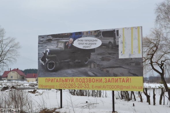На картинке Азаров смотрит на ямы и спрашивает: "Знову папєрєдніки гроші на дороги укралі?". На щите написали также прямые телефоны областного автодору с призывом звонить туда жаловаться. Щит простоял всего несколько дней. Служба автомобильных дорог области демонтировали его. Люди говорят, им уже не под силу терпеть бездорожья.