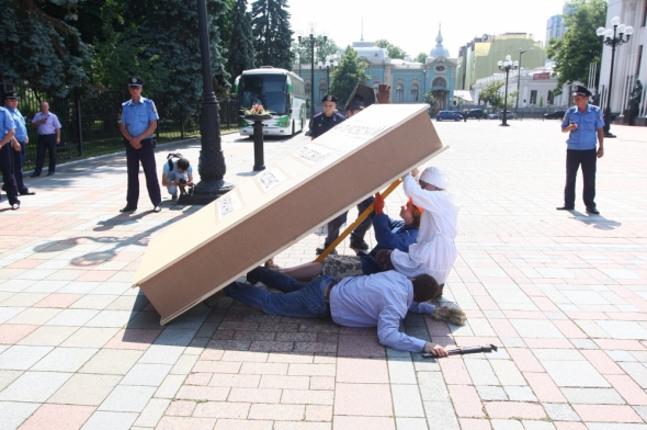 Они провели театрализованное действо, во время которого три человека попытались "реанимировать" скелет. Люди играли роль депутатов от "Батькивщины", УДАРа и Партии регионов. По их словам, депутаты именно этих политических сил поддерживают рассмотрение этого законопроекта в парламенте.