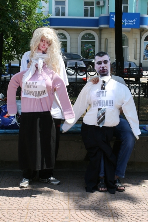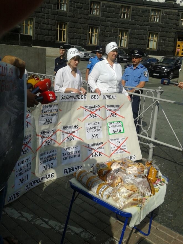 Они повязали на лоб белые повязки с надписью "голодую". В руках держали большой плакат, где перечеркнуты ряд хлебокомбинатов, которые уже закрыты. Женщины принесли к Кабмину несколько буханок хлеба из своего комбината. Они убеждены - если их комбинат закроют, то киевляне останутся без хлеба. Кроме того, по их мнению, закрытие связано с тем, что депутат от фракции ПР Мысык построил свой хлебокомбинат под Киевом. Однако, по их мнению, этого все равно не хватит для того, чтобы обеспечить продуктом весь город.