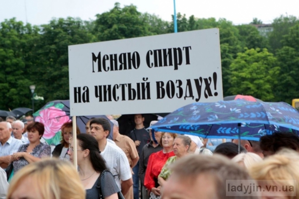 Пять сотен жителей города Ладыжин Винницкой области вышли на акцию протеста из-за неприятного запаха. Они убеждены, что вонь в городе - от местного спиртзавода, который работает без очистных сооружений и сливает отходы производства в пруд. Люди вывозят из города детей, а мэр Валерий Коломойцев объявил чрезвычайное положение.