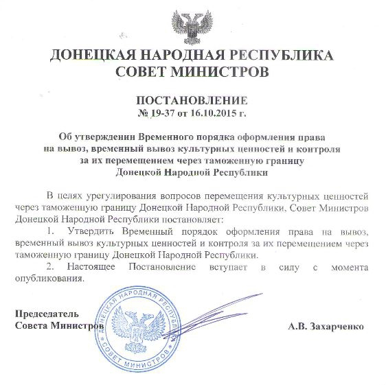 "Совет министров ДНР "во главе с Александром Захарченко подписали" документ ", который будет контролировать перемещение культурных ценностей через границу" Донецкой народной республики ".