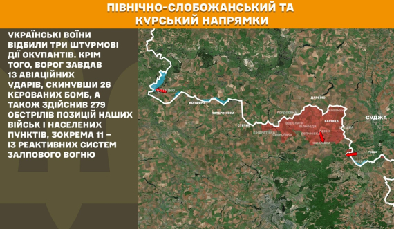 С начала дня украинские солдаты отбили три нападения оккупантов в северных направлениях Слободжана. Кроме того, противник нанес 13 воздушных ударов, сбросил 26 управляемых бомб, а также осуществил 279 атак на позиции украинских войск, в том числе 11 из нескольких ракетных пусковых установок.