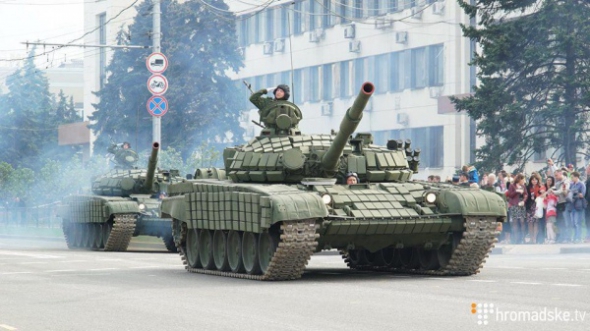 После марша в центре города проехалась военная техника. В частности, БТР, гаубицы, танки Т-72, минометы, которые должны быть удалены от линии соприкосновения на 30 и 15 километров соответственно.