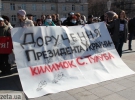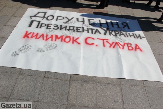 В 10.00 митингующие разворачивают большое полотно с надписью "Поручения Президента Украины - коврик С. Тулуба". Здесь собралось около 30 больных. Разворачивают плакаты с надписью "Фрезениус - это жизнь". На лицо надевают повязки с надписями "Инвалид первой группы".