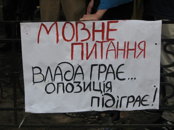 В 13:00 напротив ОГА собралось около 30 человек с государственными флагами и плакатами: "Нет расколу Украины", "Языковой вопрос: власть играет ... оппозиция подыгрывает", "Настоящий языковой вопрос: "Где дешевый газ?" и другими.