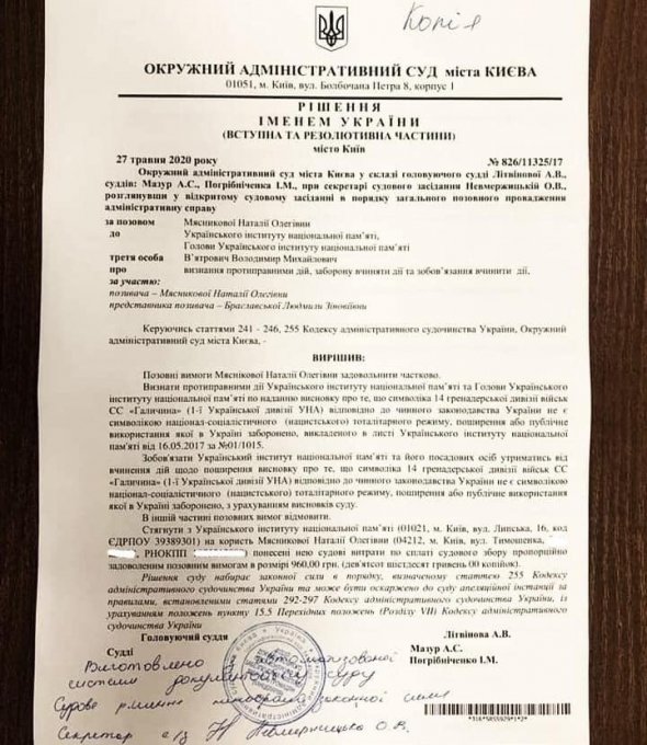 Коллегия судей частично удовлетворила исковые требования Мясниковой, признав противоправным заявление Вятровича и обязав институт "воздержаться от распространения выводов" о том, что символика дивизии СС "Галичина" не является нацистской.