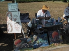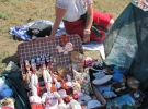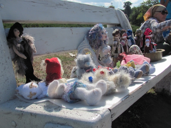 У лавок на траве торговцы разложили палатки с гончарными изделиями. С желающих сфотографироваться берут по 10 гривен. Ближе к Днепру установили сцену. Здесь выступают кружки народной самодеятельности. Справа от сцены разложили две части белого полотна. Желающие могут оставить отпечаток своей ладони на холсте желтой или голубой краской. Так создадут желто-голубой флаг с отпечатков ладоней Черкасс.