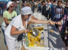 "Кукурузу вареную в котле пробую первый раз в жизни. Когда в селе жила, воровали у соседа на огороде. Мать варила в обычной эмалированной кастрюле и немного присаливали, чтобы была сочная и жесткая. Вот в этом году праздник удался: хорошо можно наесться. Сначала выпила клюквенного морса, правда думала, что бесплатно, но сказали 5 гривен заплатить. Кукурузой закусила, еще пойду на пампушки с чесноком очередь займу", - вытирает салфеткой лицо черкащанка Светлана Кононенко.