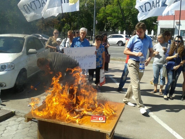 Активисты устроили перед посольством перформанс. Они принесли с собой деревянный стол и разложили на нем товары российских производителей, которые продаются в Украине: две бутылки пива, минеральную воду, консервы, шоколад и пакеты мобильного оператора МТС. После этого все эти товары облили зажигательной жидкостью, и подожгли.