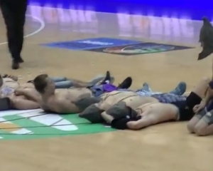 Украинские фаны провели во время матча Евробаскета с Россией флешмоб против торговой войны. Так болельщики во время перерыва забросали российских спортсменов конфетами. После этого несколько ребят выбежали в центр зала в шапках-буденовках и с голыми торсами легли на пол. На груди у них были написаны буквы, что в итоге составили слово "Таможня". Через несколько секунд ребята ушли с площадки, из зала их вывели охранники, которые затем собрали конфеты. Вместе ч тем фаны также растянули баннер - "ROSHEN лучше водки".