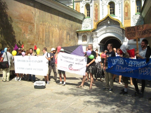 У входа в Киево-Печерскую Лавру состоялась акция в поддержку трех участниц российской панк-группы Pussy Riot, которых год назад приговорили к тюремному заключению за исполнение песни "Богородица, Путина прогони" в Храме Христа Спасителя в Москве. Около 25 человек пришли с плакатами "Свободу Pussy Riot", "Церкви и государству жить отдельно, а умереть вместе", "Защитим детей от церковной морали". "Приговор Pussy Riot ознаменовал победу клерикальной юстиции в России, - считают организаторы акции. - В обвинительном приговоре девушкам судьи ссылались на постановления средневекового Трулльского собора. А сейчас такие вещи становятся возможными и в Украине".