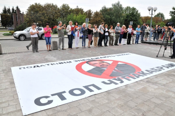 Несколько десятков журналистов газеты "Экспресс" пикетировали здание регионального управления Министерства доходов. Митингующие выстроились в шеренгу, положив руки на плечи друг другу. Перед собой они положили большой баннер размером 3х6 метра с перечеркнутым изображением министра Министерства доходов и сборов Александра Клименко. На баннере было две надписи: "Налоговики нарушают закон. Стоп Чупакабра! ".