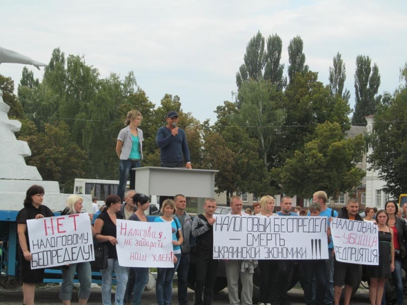 Люди около часа митинговали под налоговой. Держали плакаты: "Налоговый беспредел - смерть украинской экономики", "Налоговая, не отнимай наш хлеб", "Нэт налоговому беспределу", "Налоговоя - убийца компании!".