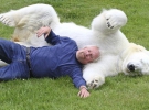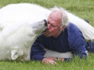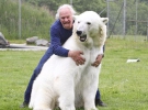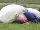 Канадский дрессировщик Марк Думас и белая медведица Эджи вместе играют, плавают в бассейне и катаются в обнимку по траве. Иногда они дремают рядом.