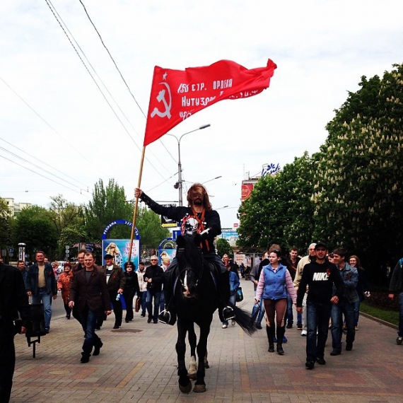 В Донецке по случаю Дня Победы проходит митинг на, который приехал российский артист Никита Джигурда, он выехал к людям на коне с криками "любить по-русски".