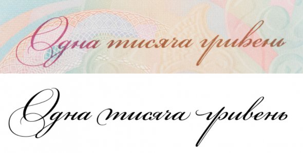 В то же время контур некоторых букв напоминает любительскую кириллизацию. Например, шрифт Bickham Script, использованный в надписи "Одна тысяча гривен", имеет официальную украинскую кириллизацию. По мнению Шевченко, в дизайне банкноты использована и российская пиратская кириллизация.