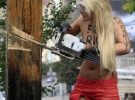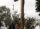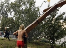 Активистки женского движения FEMEN спилили бензопилой и повалили поклонный крест в центре Киева недалеко от Международного центра культуры и искусств (Октябрьский дворец).
