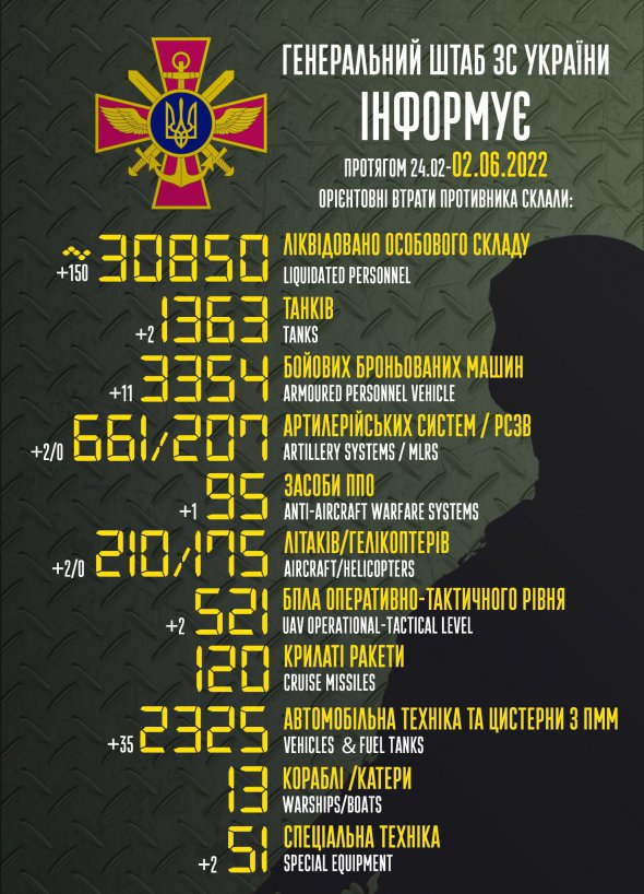 Потери российских оккупантов в Украине на 2 июня составляют примерно 30 тыс. 850 человек.