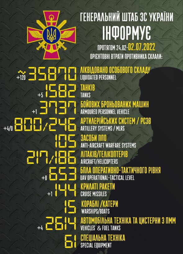 Потери российских оккупантов в Украине на 2 июля составляют 35 870 человек.