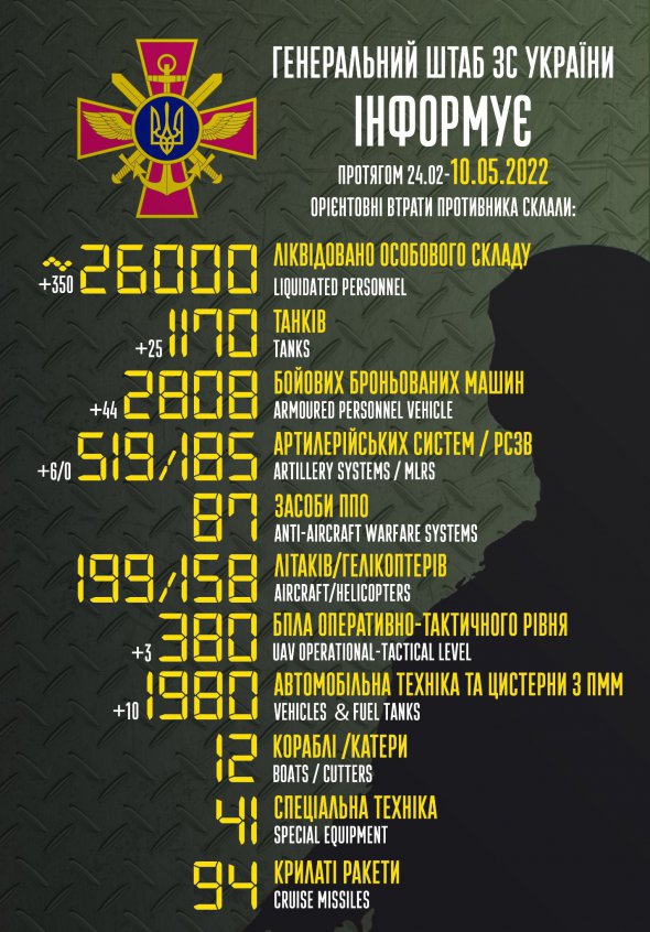 Потери российских оккупантов в Украине на 10 мая составляют примерно 26 тыс. человек.