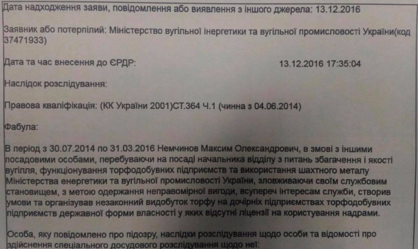 По информации, попавшей в распоряжении "Комментариев", кандидат на пост госсекретаря в Министерство энергетики находится под следствием МВД за предыдущую деятельность на должности чиновника департамента Минэнерго. Согласно материалов МВД, в период с 30.07.2014 по 31.03.2016 года кандидат на должность госсекретаря Немчинов Максим Александрович был организатором ряда преступных схем, занимая должность начальника отдела по вопросам обогащения угля, функционирования торфодобывающих предприятий, использования шахтного метала. По всем эпизодам ведутся следственные действия.