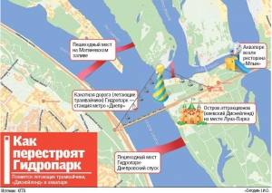 Планируется, что Гидропарк свяжут пешеходным мостом с Днепровским спуском. А на склонах Днепра в районе одноименной станции метро появится станция канатки — летающие трамвайчики повезут народ через Днепр в Гидропарк. В районе ресторана "Млын" появится небольшой аквапарк с водными горками. Скорее всего, их будет не больше семи — пять крутых для взрослых, а две — для малышей.