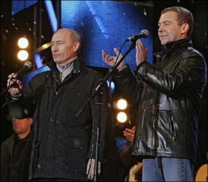 "Давай за них, давай за нас, и за Сибирь и за Кавказ", - голосил Расторгуев. Путин и Медведев продвигались к сцене. "Давай за вас, давай за нас, и за десант и за спецназ. За боевые ордена, Давай поднимем, старина", - неслось на площади. Наконец два президента вышли к беснующейся молодежи.