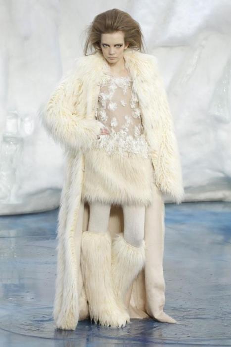 В своей коллекции для Chanel Лагерфельд отправил культовые вещи модного дома в будущее. Поэтому твидовые костюмы, неприталенные вечерние платья и кукольные пальто предстали в металлизированных серебристых оттенках.