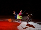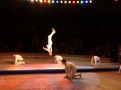 В первом отделении выступали воздушные гимнасты Мария Главатских и Алексей Григоров, прыгуны на дорожке под руководством Владимира Мишастова и акробаты под руководством Александра Чан-Мина, которые выполняли трюки на мачтах.