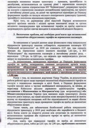 По словам члена постоянной комиссии по вопросам бюджета и социально-экономического развития Сергея Мельника, в настоящем документе "экономически обоснованными" называются такие цифры: проезд в метрополитене - 2,52 гривны, проезд в наземных видах транспорта - 1,9 гривны.