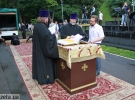 Помолиться вместе с патриархом пришли около тысячи верующих. Они стояли за железными заборами, которыми оградили дорожку, ведущую к памятнику - к нему пускали только журналистов. Вдоль щитов стояли сотрудники милиции в штатском, также в парке следили за порядком несколько десятков охранников в костюмах и с наушниками в ушах.