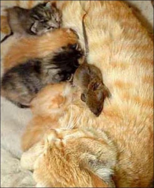 Китайская кошка, недавно родившая котят, приняла в свою семью мышь, позволив той жить вместе с новорожденными. В свое время саму кошку принесли в магазин детской одежды как раз для ловли мышей.