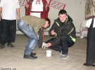 После спектакля для детей провели конкурсы. Один из традиционных андреевских конкурсов - это передувание муки. Вышли двое мальчиков. Перед ними поставили две миски с перьями. Когда игрокам завязали глаза, то перья заменили на муку. На счет три они начали вовсю дуть.