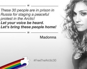 В своем аккаунте в Instagram Мадонна разместила изображение с плакатом #FreetheArctic30. "Эти 30 человек находятся в российской тюрьме за организацию мирного протеста в Арктике! Пусть ваш голос будет услышан. Давайте вернем этих людей домой!", - пишет певица.